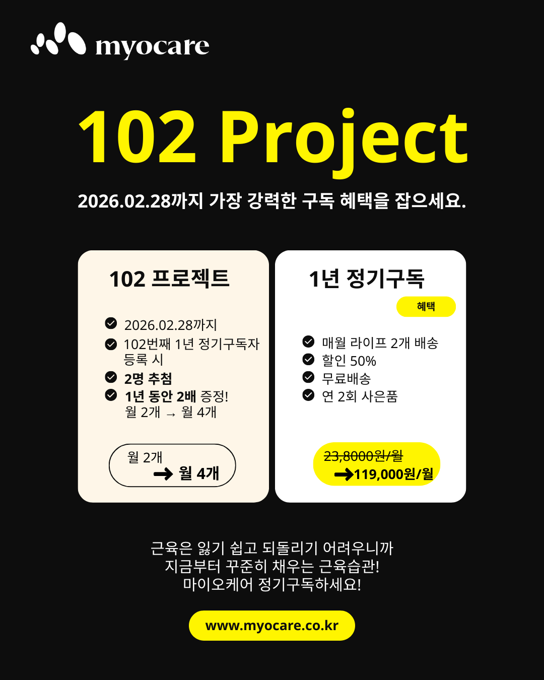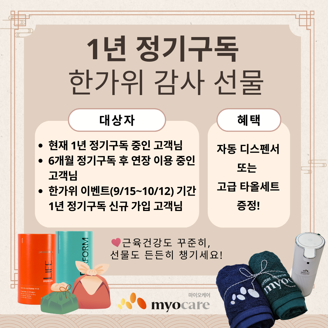 마이오케어는 1년 정기구독을 통해 꾸준히 근육 건강을 지켜주시는 소중한 고객님들께 진심 어린 감사를 전하고자 합니다.